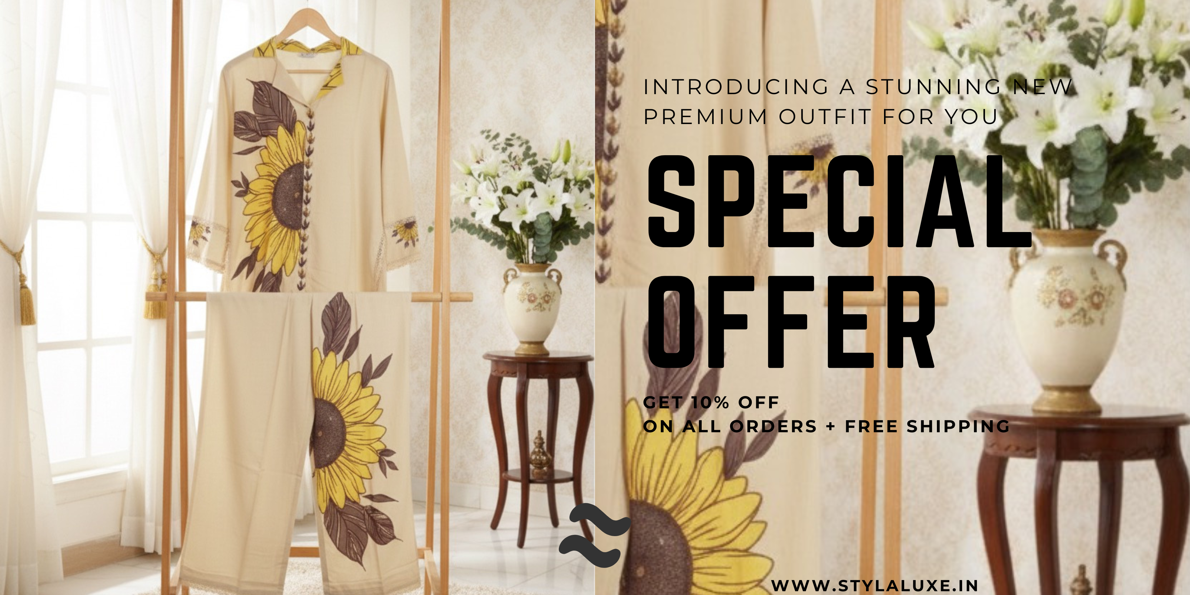 The soothing beige tone combined with sunflower motifs creates a look that’s fresh, classy, and eye-catching — perfect for daily wear, brunch dates, travel looks, and stylish outings.
