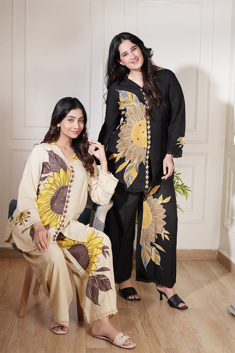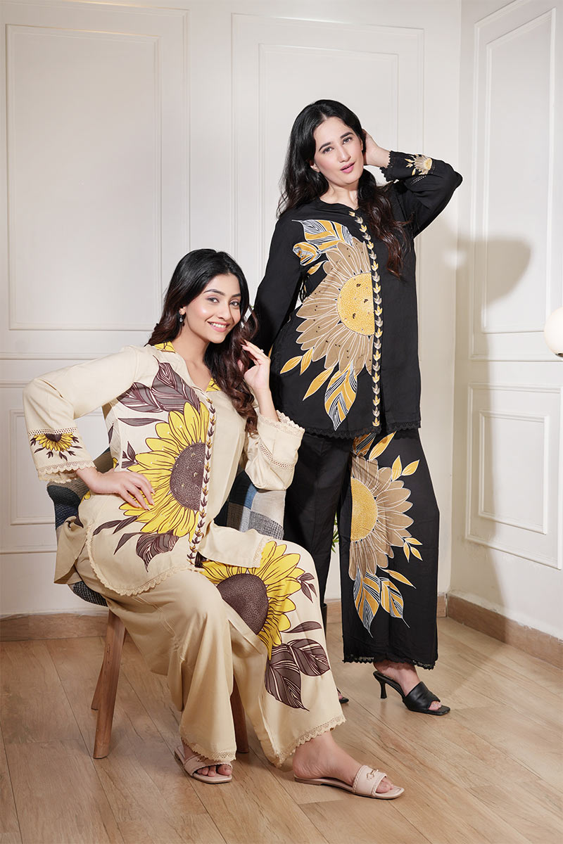 Step into effortless elegance with the Black Sunflower Printed Co-Ord Set, crafted to bring out your bold, confident, and feminine side.